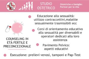 – Counseling in età fertile e preconcezionale: Educazione alla sessualità (ultilizzo contraccettivi, malattie sessualmente trasmissibili e tanto altro, Corsi di orientamento educativo alla sessualità per diversabili e operatori dedicati alla loro assistenza, Pavimento Pelvico (aspetti educativi), Esecuzione: prelievi ematici, tamponi (cervicali, vaginali, rettali, faringei), Pap Test, HPV DNA test.