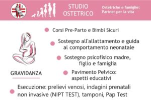 – Gravidanza: Corsi Preparto Personalizzati e standard, Corsi Bimbi sicuri (sicurezza bimbi a casa in auto e durante la nanna), Sostegno durante l’allattamento e guida al comportamento neonatale, Sostegno psicofisico (madre, figlio e famiglia), Pavimento Pelvico (aspetti educativi), Esecuzione: prelievi ematici, test genetici prenatali non invasivi (Nipt Test), tamponi (cervicali, vaginali, rettali, faringei), Pap Test, HPV DNA test.