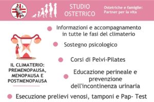 – Il Climaterio (Premenopausa, Menopausa, Postmenopausa): Informazioni e accompagnamento in tutte le fasi del climaterio, Sostegno psicologico, Corsi di Pelvipilates, Educazione perineale e Prevenzione dell’incontinenza urinaria, Esecuzione: prelievi ematici, tamponi (cervicali, vaginali, rettali, faringei), Pap Test, HPV DNA test.