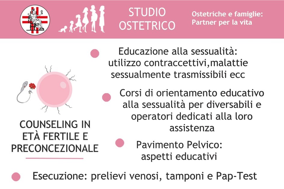 – Counseling in età fertile e preconcezionale: Educazione alla sessualità (ultilizzo contraccettivi, malattie sessualmente trasmissibili e tanto altro, Corsi di orientamento educativo alla sessualità per diversabili e operatori dedicati alla loro assistenza, Pavimento Pelvico (aspetti educativi), Esecuzione: prelievi ematici, tamponi (cervicali, vaginali, rettali, faringei), Pap Test, HPV DNA test.