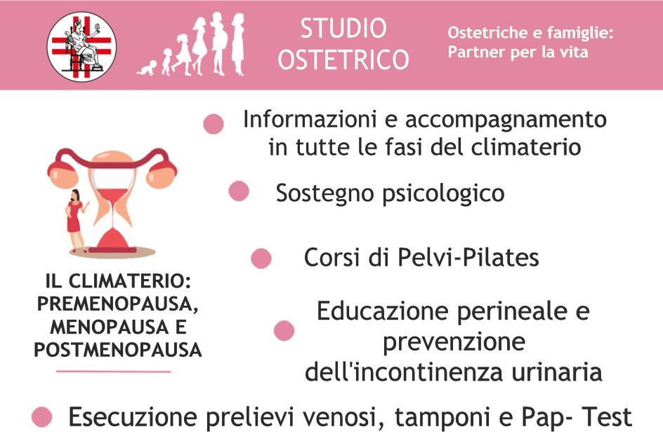– Il Climaterio (Premenopausa, Menopausa, Postmenopausa): Informazioni e accompagnamento in tutte le fasi del climaterio, Sostegno psicologico, Corsi di Pelvipilates, Educazione perineale e Prevenzione dell’incontinenza urinaria, Esecuzione: prelievi ematici, tamponi (cervicali, vaginali, rettali, faringei), Pap Test, HPV DNA test.